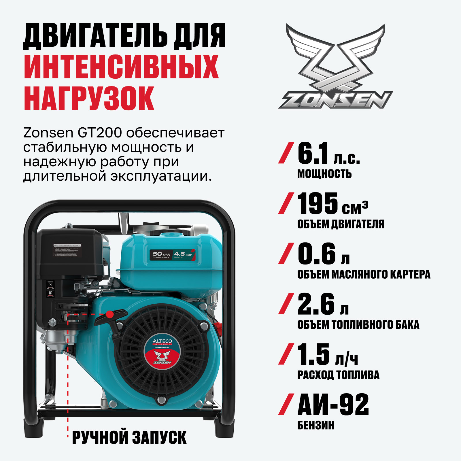 - Двигатель для интенсивных нагрузок – Zonsen GT200 обеспечивает стабильную мощность и надежную работу при длительной эксплуатации.