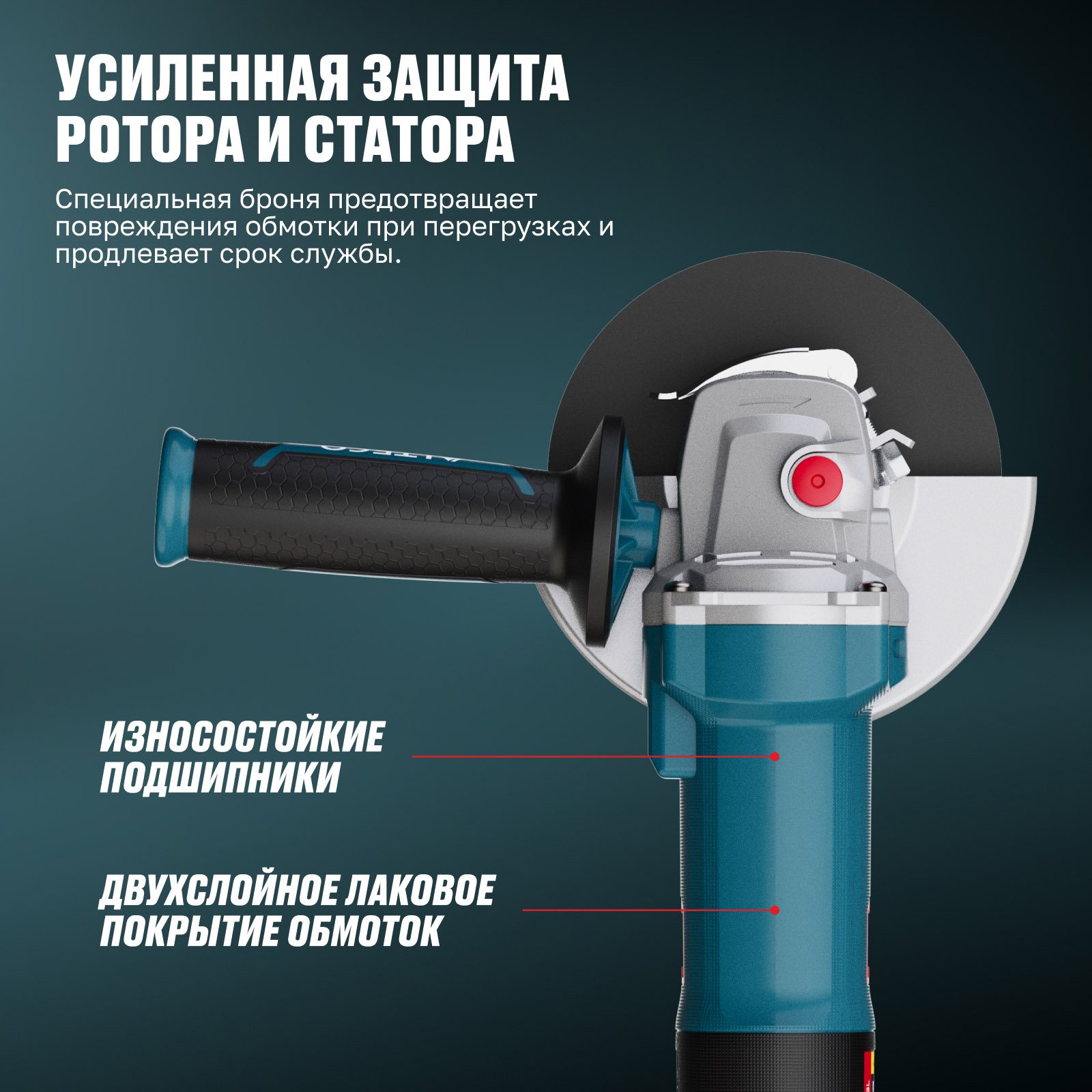 - Усиленная защита ротора и статора — специальная броня предотвращает повреждения обмотки при перегрузках и продлевает срок службы.