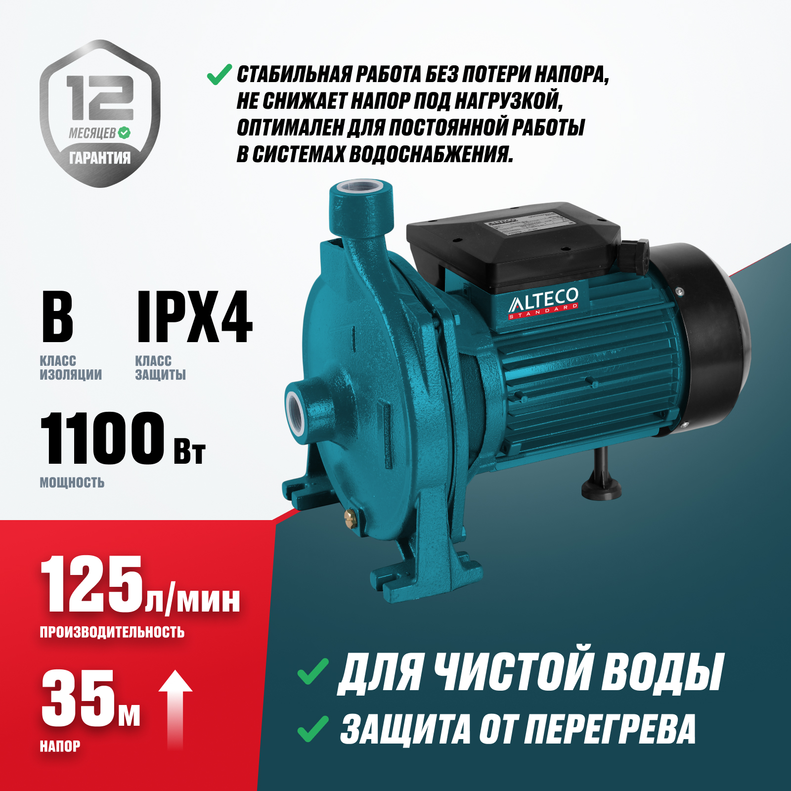 - Встроенная защита от перегрева — автоматически отключает насос при перегрузке или перегреве, предотвращая поломки. Повышает безопасность эксплуатации и снижает риск выхода оборудования из строя.