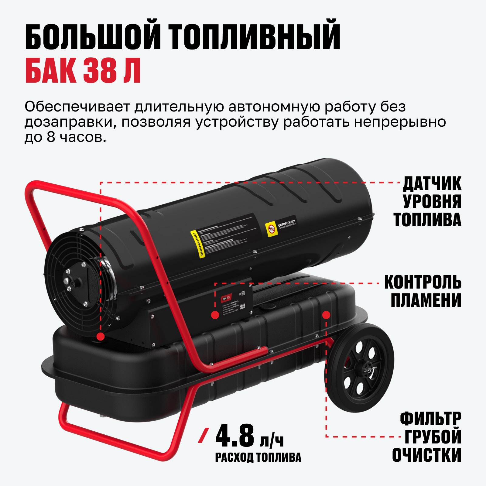 - Большой топливный бак 38 л — обеспечивает длительную автономную работу без дозаправки, позволяя устройству работать непрерывно до 8 часов.