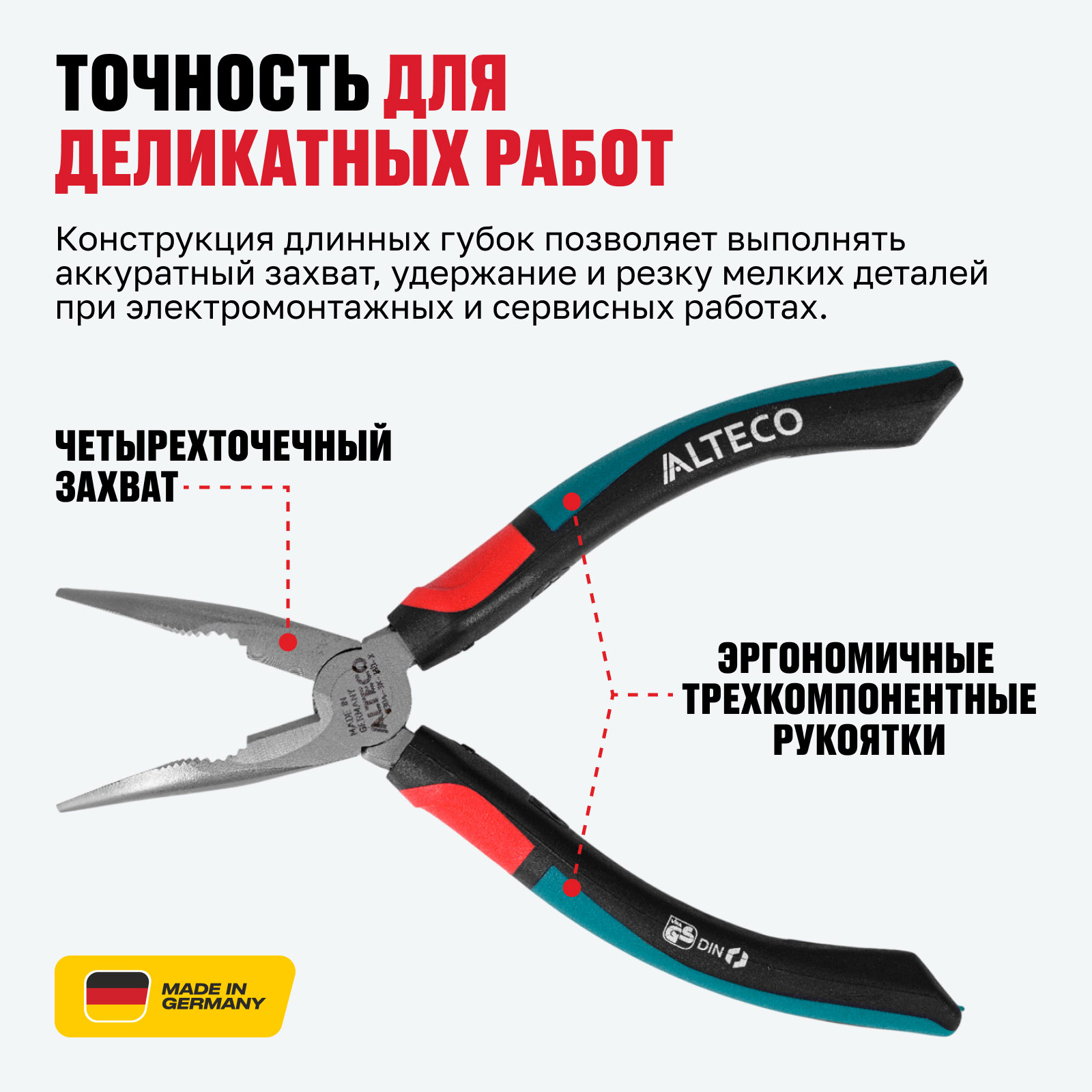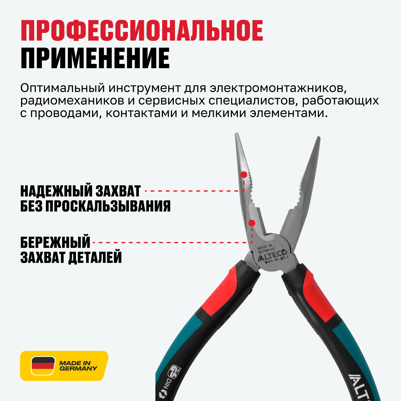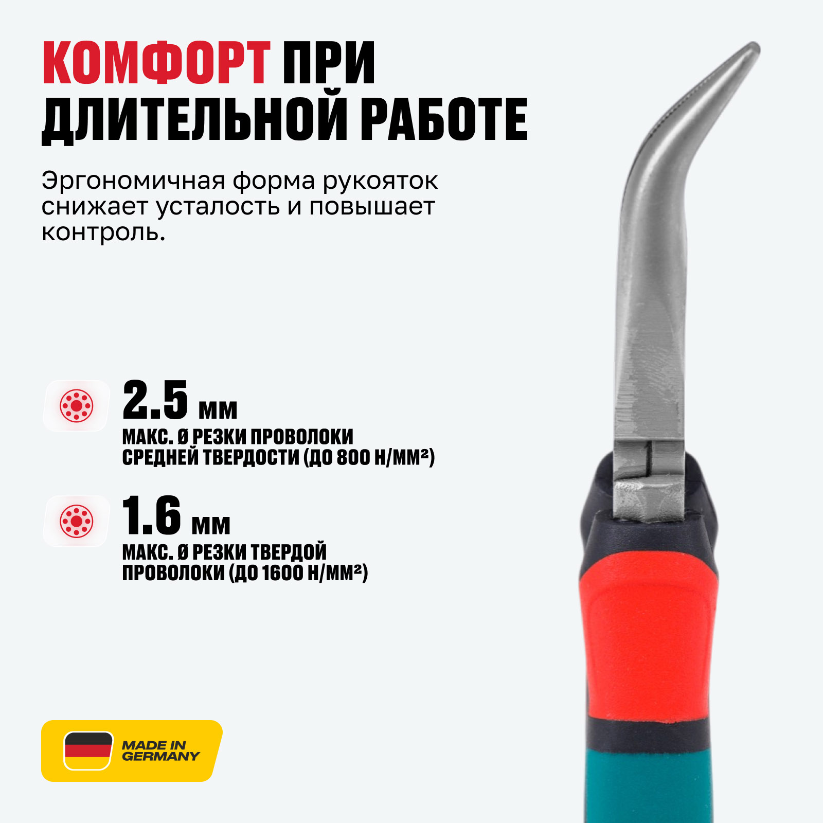 - Точность для деликатных работ — конструкция длинных губок позволяет выполнять аккуратный захват, удержание и резку мелких деталей при электромонтажных и сервисных работах.