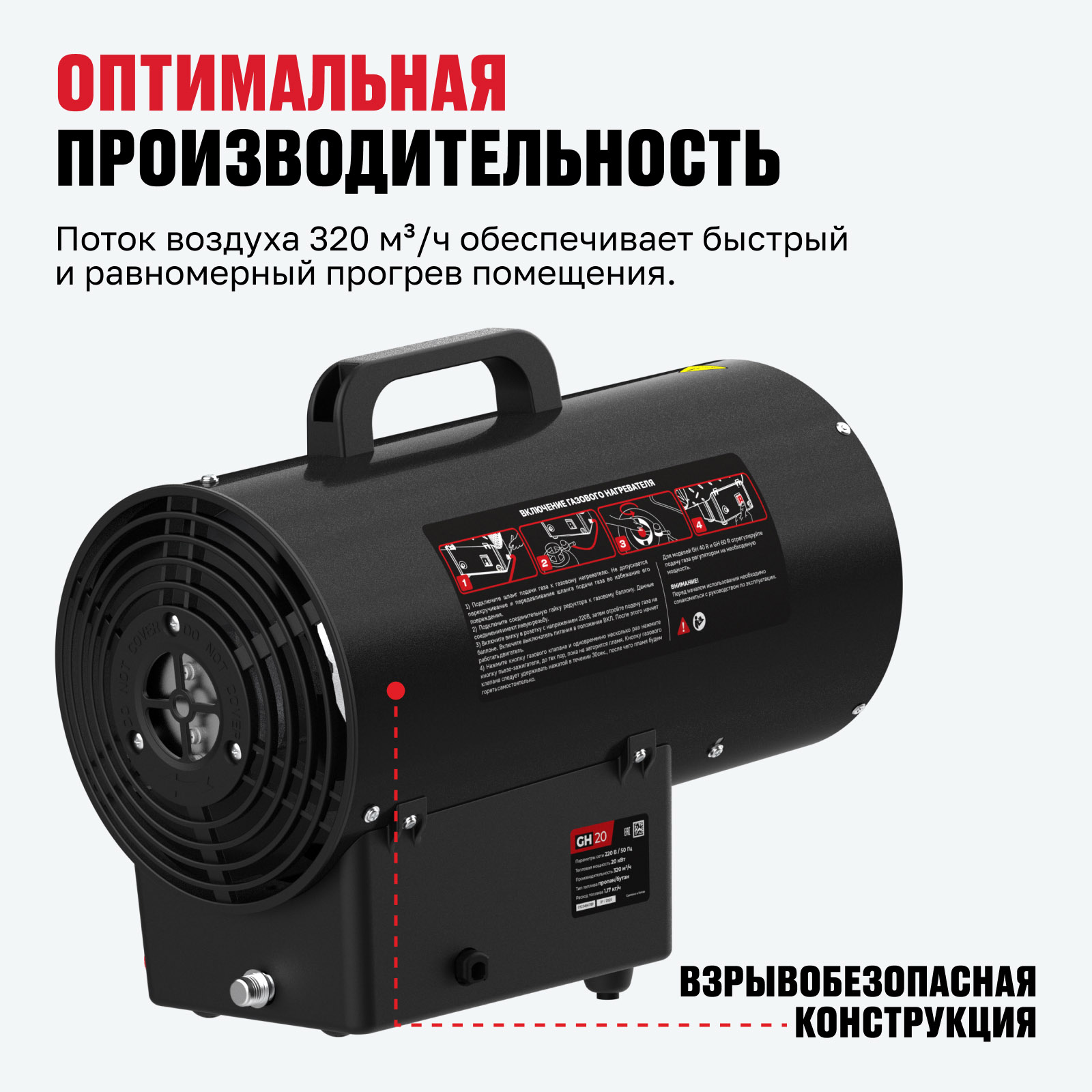 - Оптимальная производительность — поток воздуха 320 м³/ч обеспечивает быстрый и равномерный прогрев помещения.