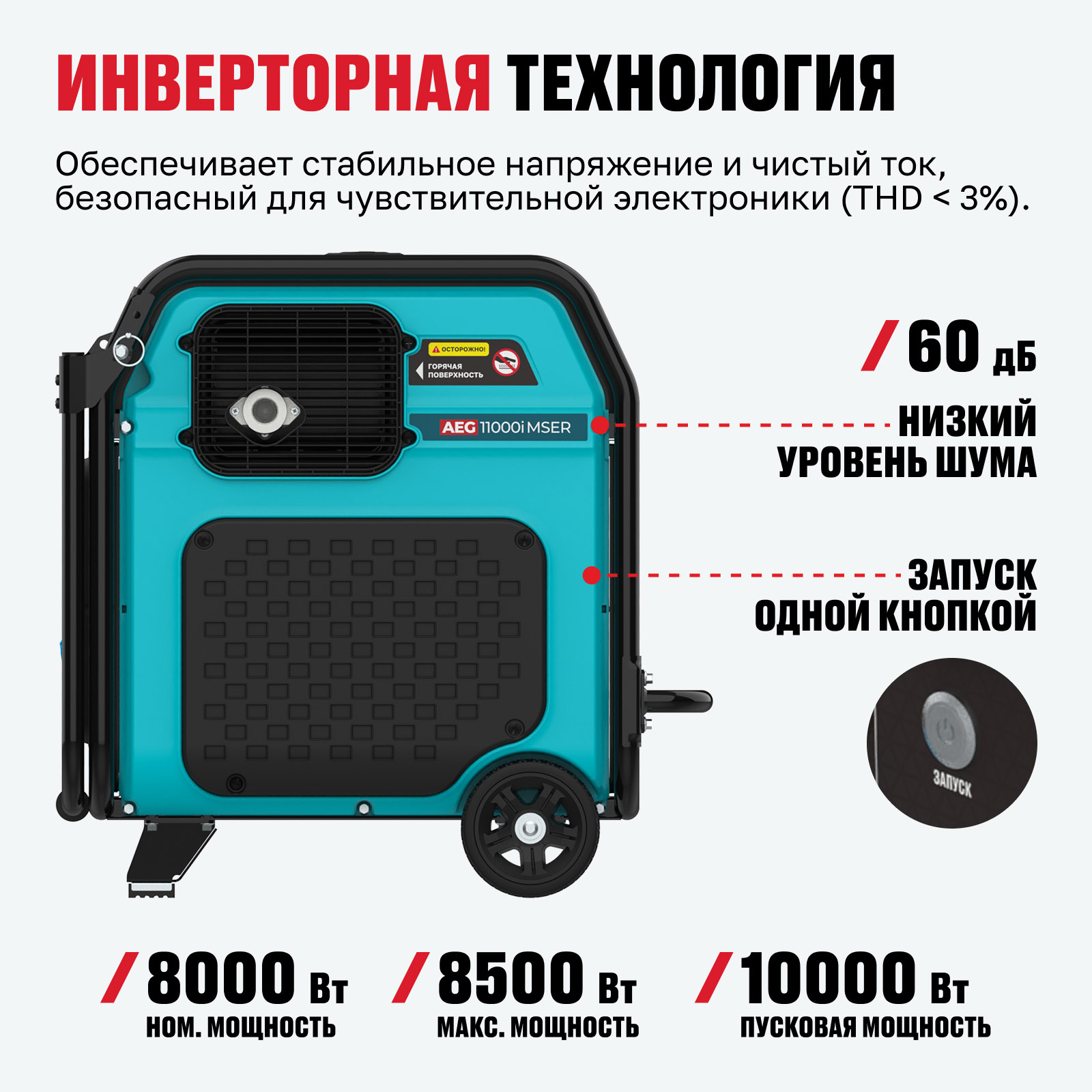 - Инверторная технология — обеспечивает стабильное напряжение и чистый ток, безопасный для чувствительной электроники (THD < 3%).