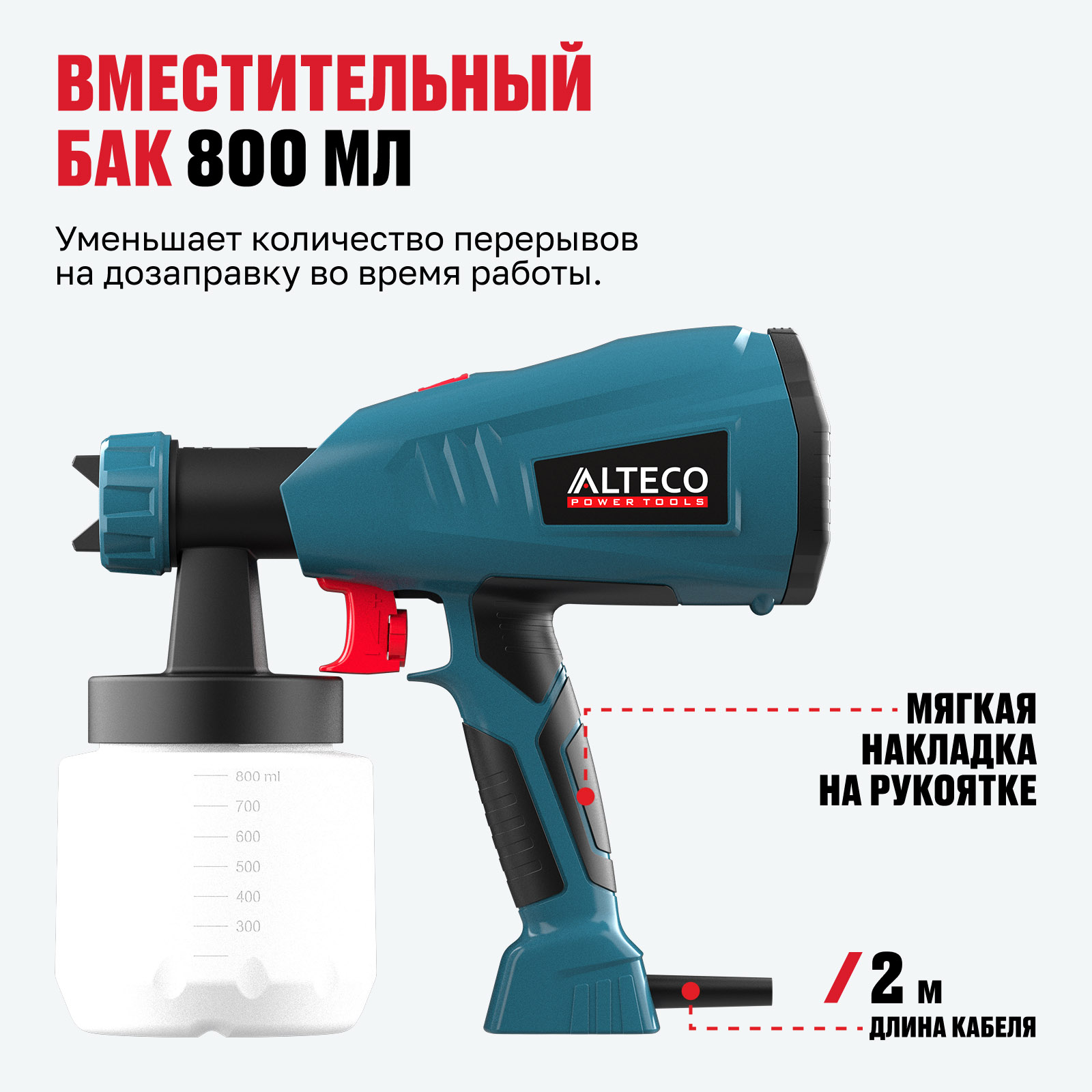 - Вместительный бак 800 мл — уменьшает количество перерывов на дозаправку во время работы.