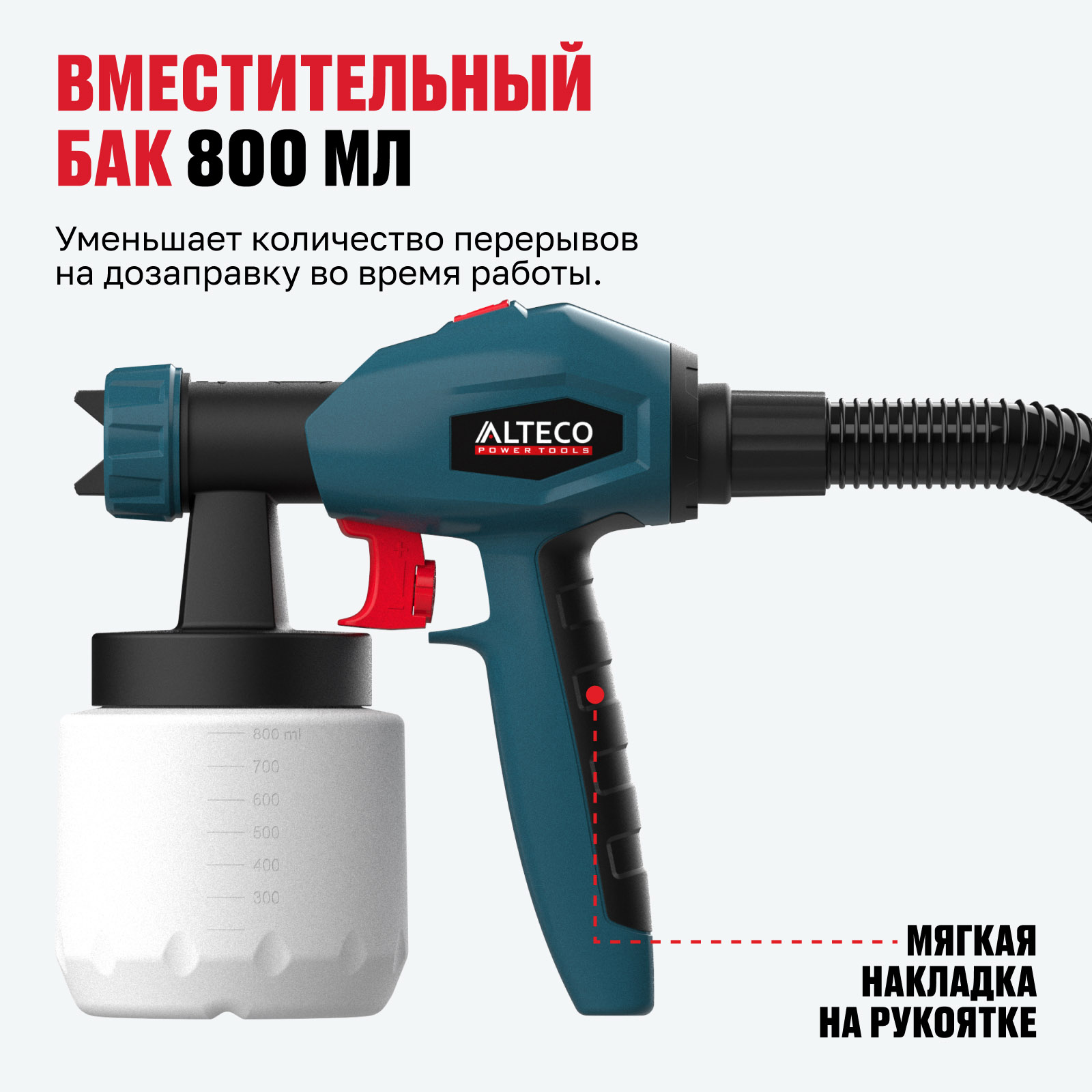 - Производительность 800 мл/мин — обеспечивает быстрый и равномерный перенос краски, сокращая время выполнения работ.