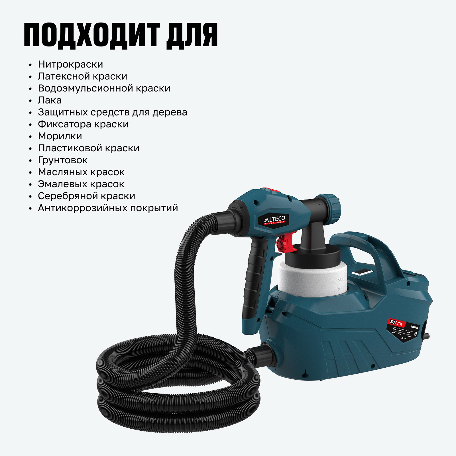 - Точная настройка подачи краски — регулировка интенсивности распыления для контроля результата.