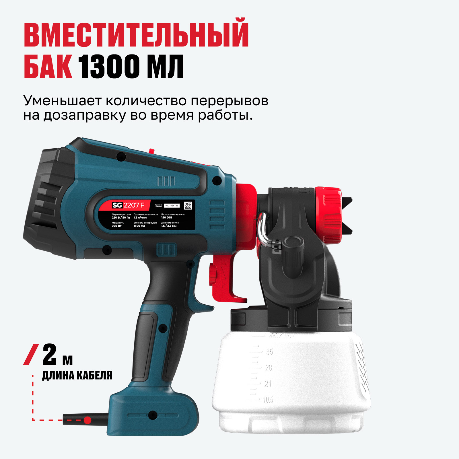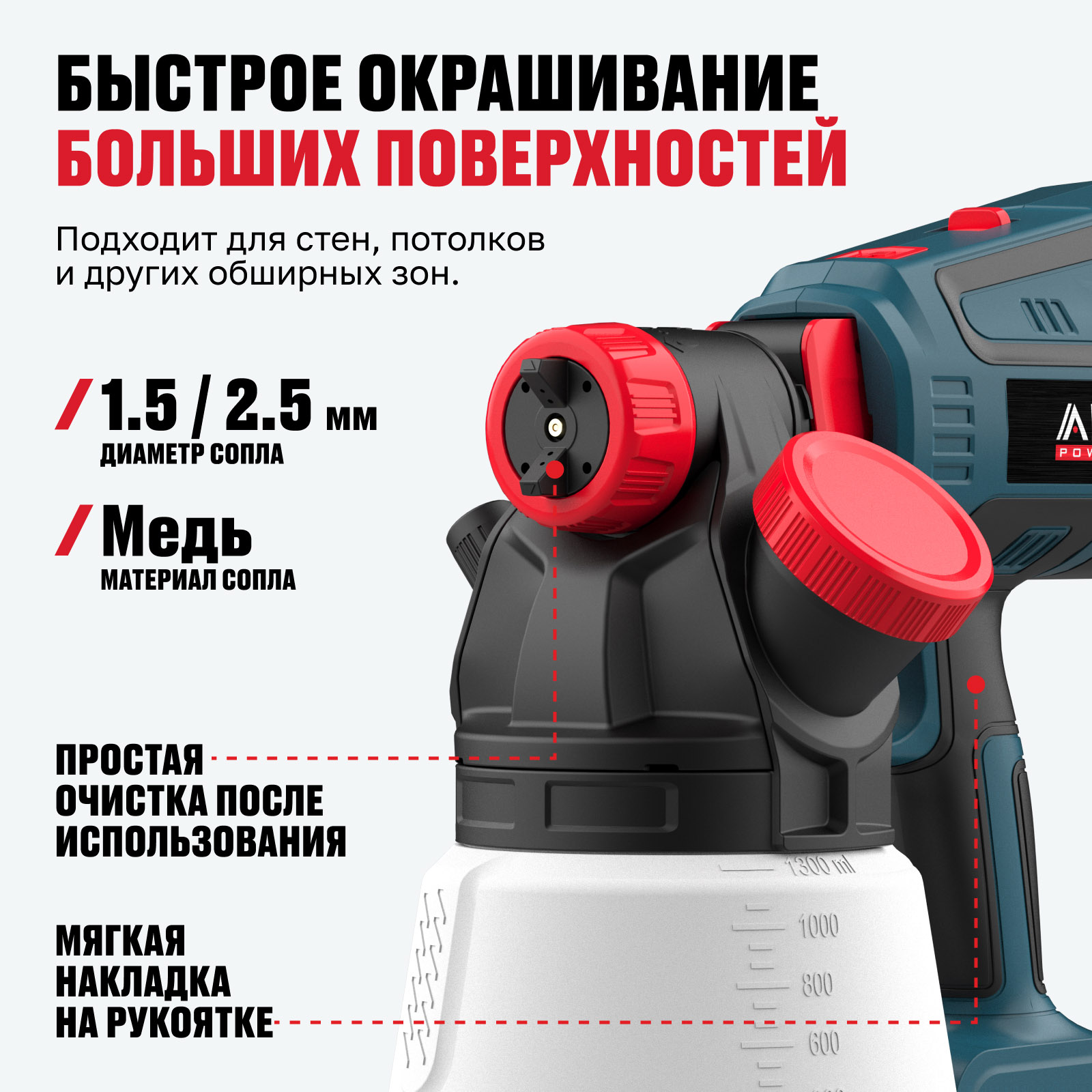- Высокая производительность 1200 мл/мин — обеспечивает быстрый и равномерный перенос краски, сокращая время выполнения работ.