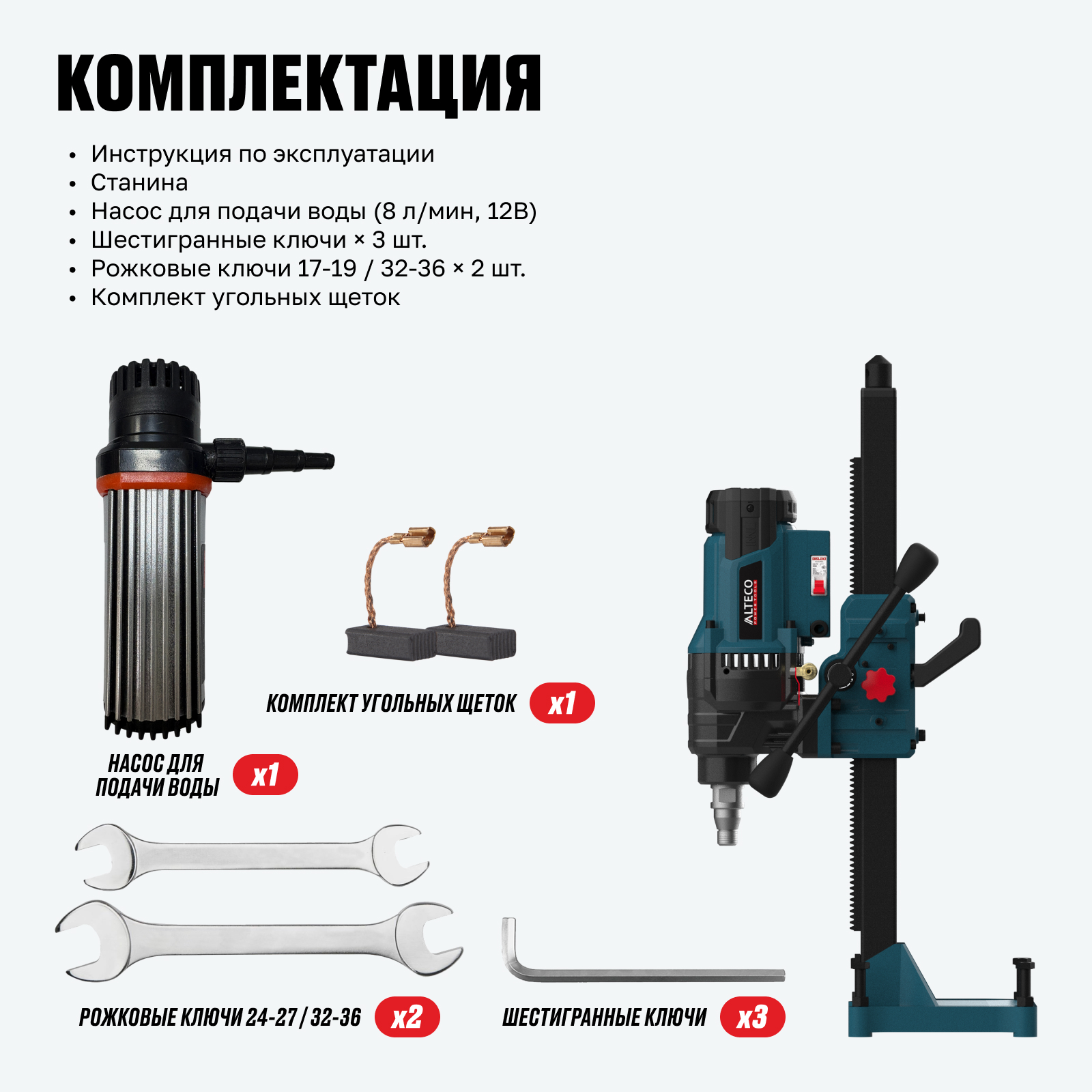 - Станина и насос для подачи воды в комплекте — готовый набор для работы без дополнительных покупок.