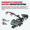 - Функция регулировки ширины обработки почвы — обеспечивает возможность настройки культиватора под конкретные задачи. С помощью смены конфигурации рабочих лезвий можно уменьшить или увеличить ширину захвата