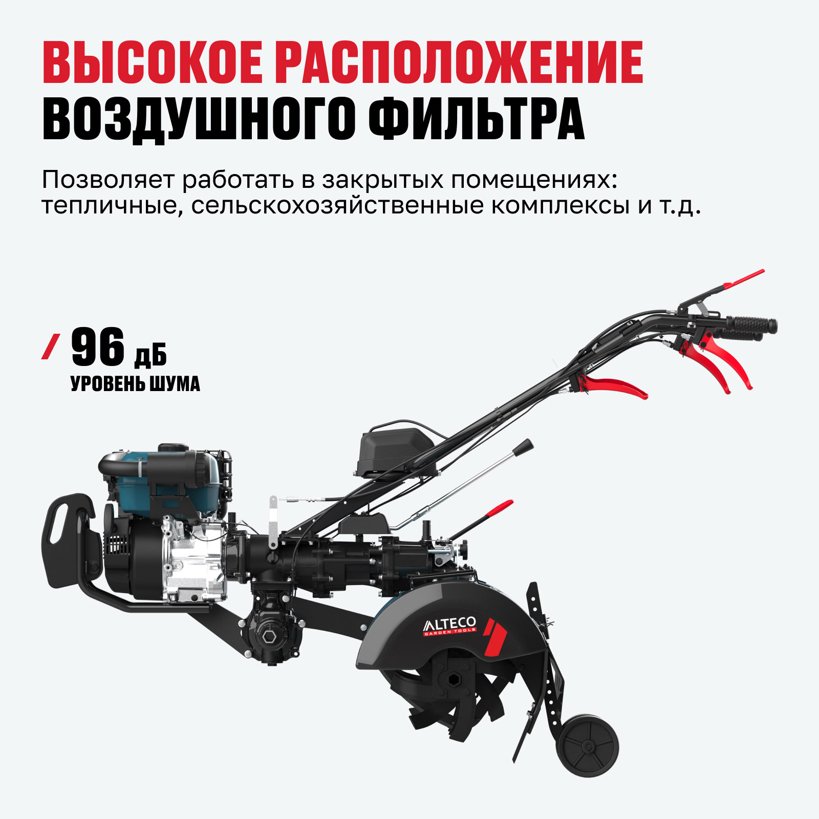 - Высокое расположение воздушного фильтра — позволяет работать в закрытых помещениях: тепличные, сельскохозяйственные комплексы и т.д.