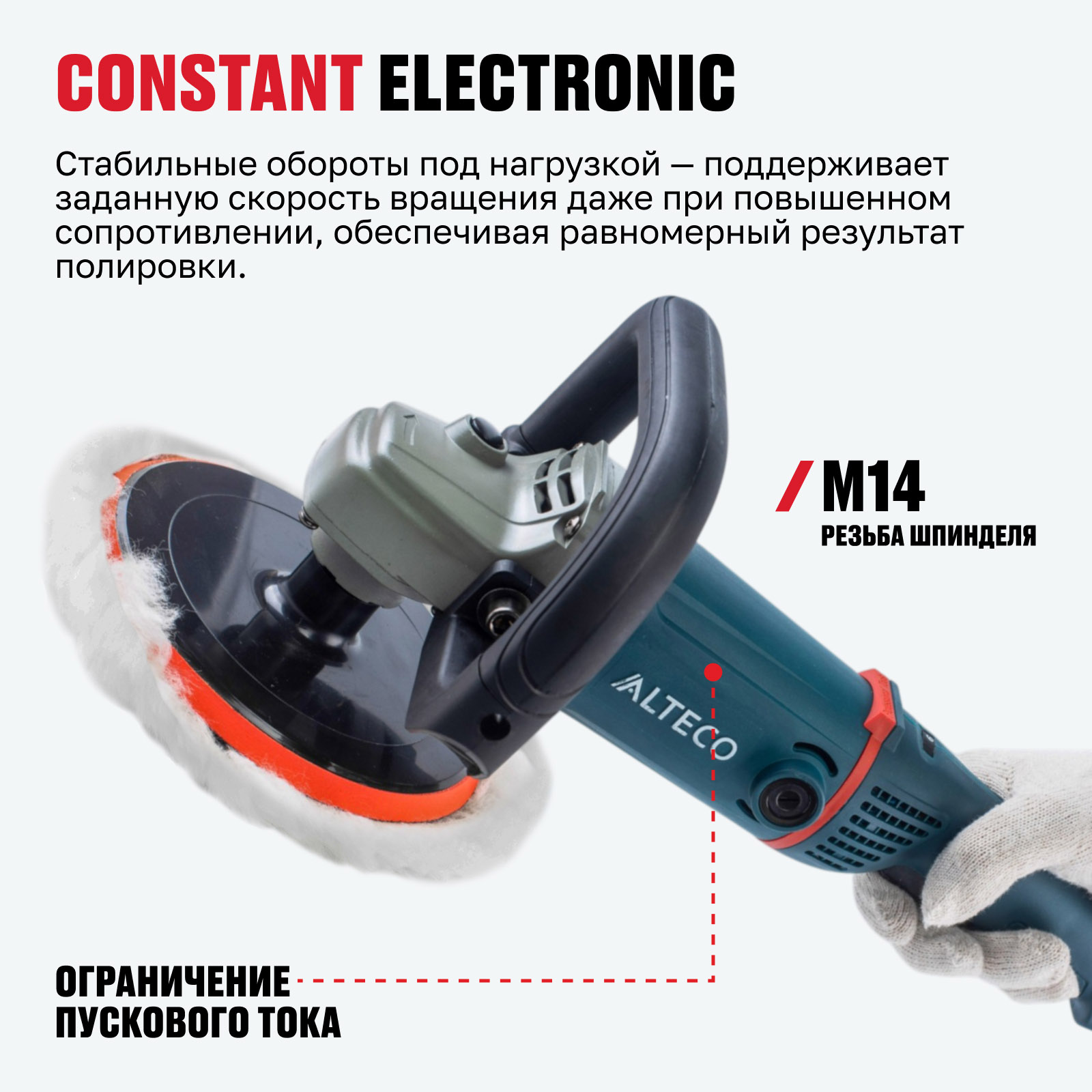 - Constant Electronic — стабильные обороты под нагрузкой — поддерживает заданную скорость вращения даже при повышенном сопротивлении, обеспечивая равномерный результат полировки.