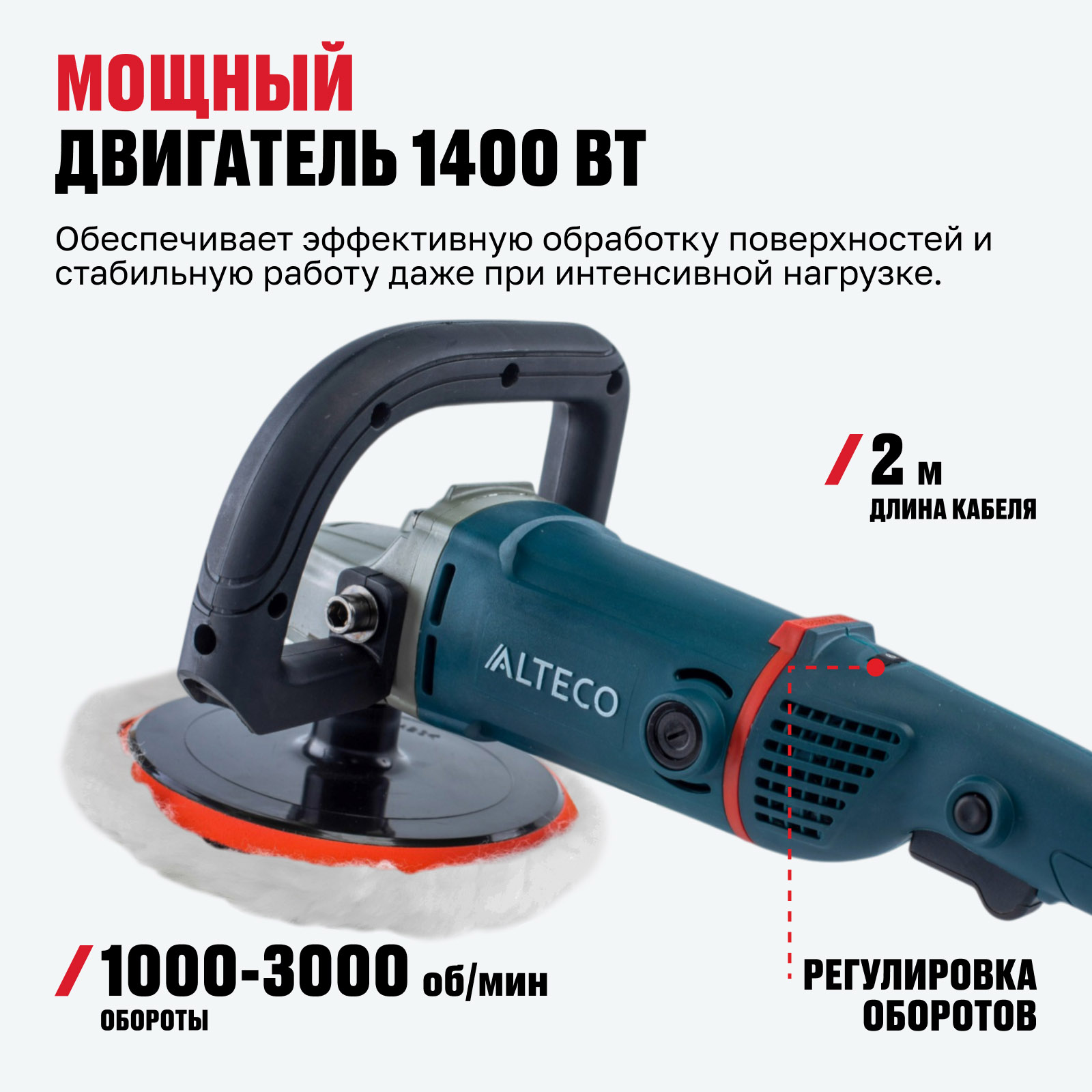 - Мощный двигатель 1400 Вт — обеспечивает эффективную обработку поверхностей и стабильную работу даже при интенсивной нагрузке.