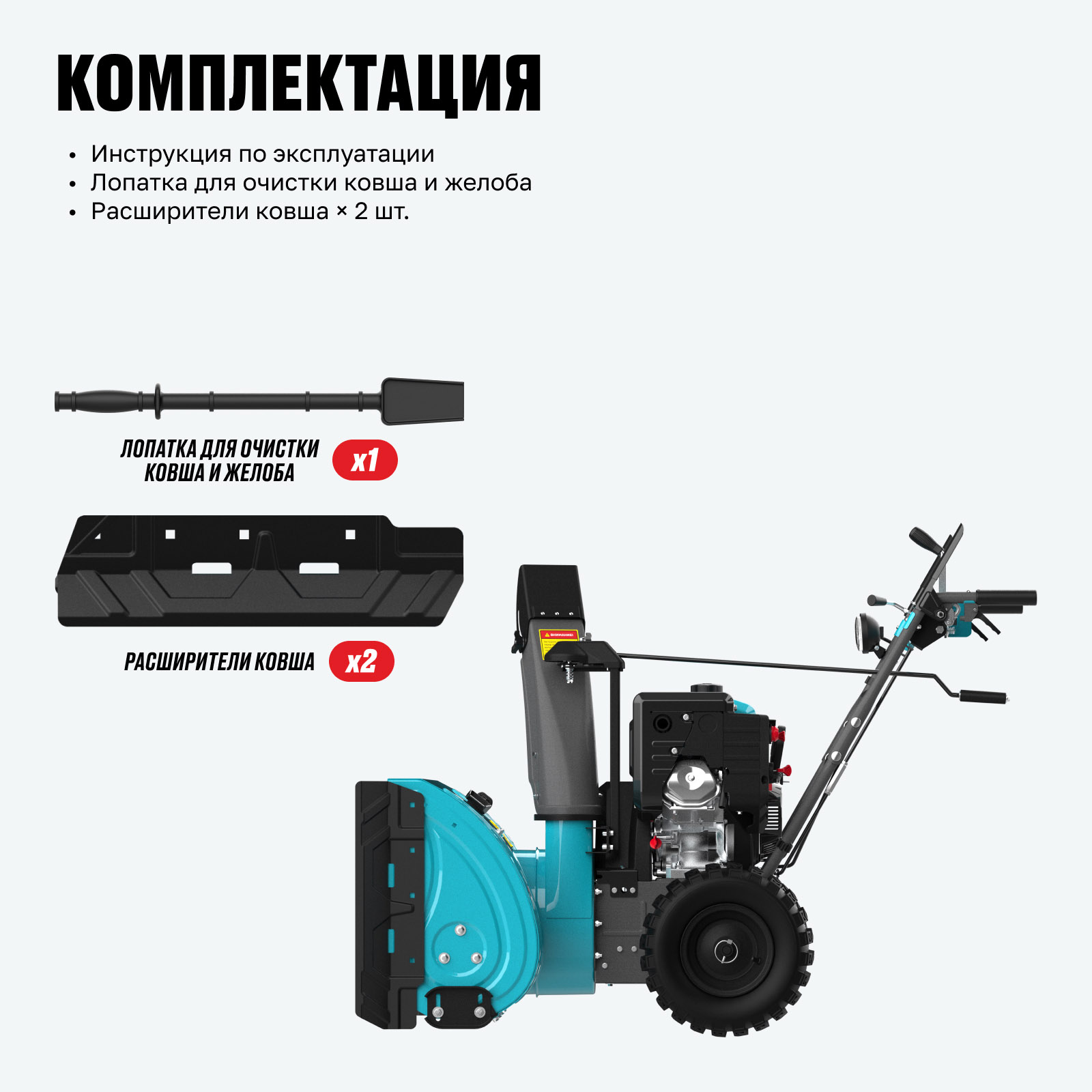 - Лопатка в комплекте — удобная очистка выбросного желоба от наледи и снега.