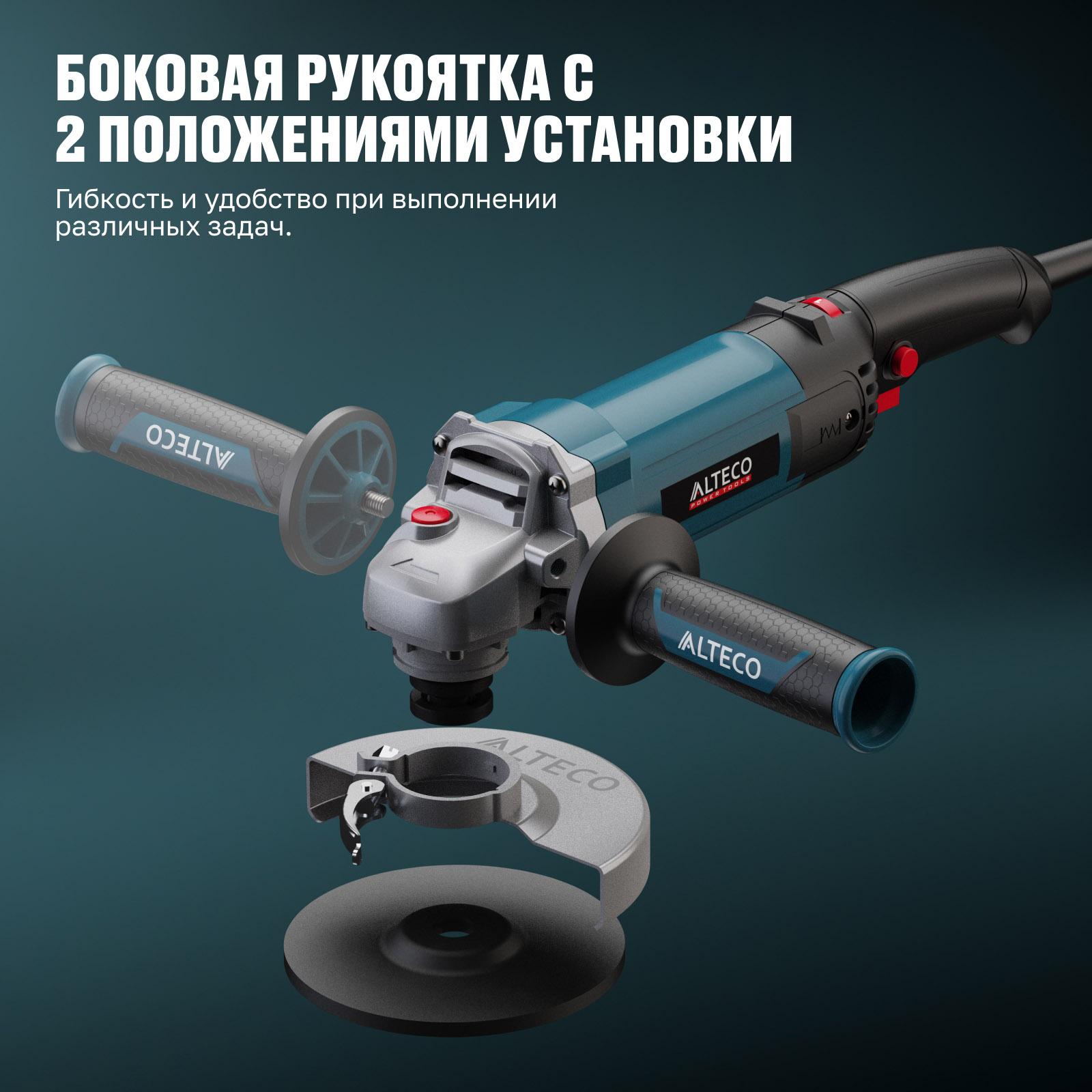- Боковая рукоятка с 2 положениями установки — гибкость и удобство при выполнении различных задач.