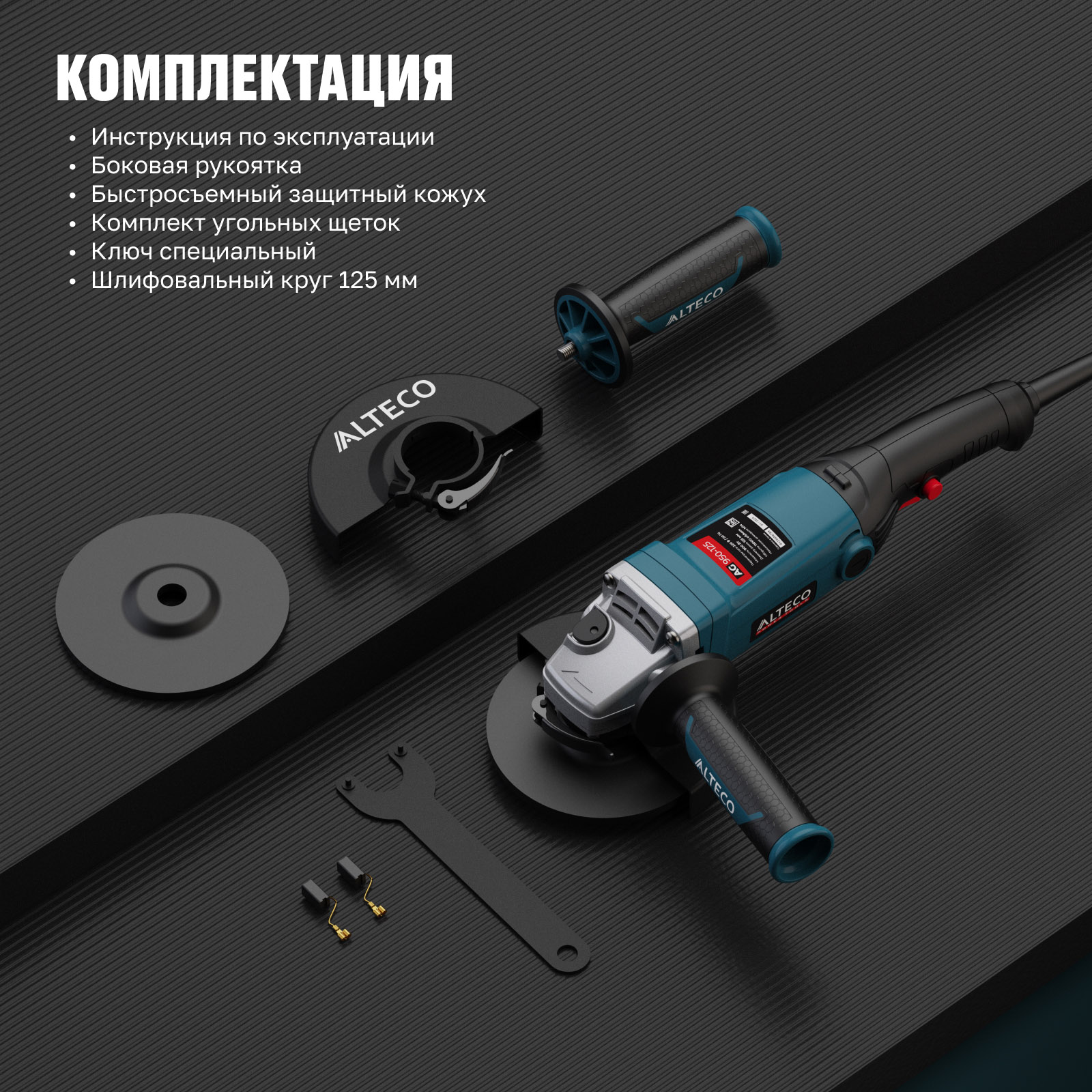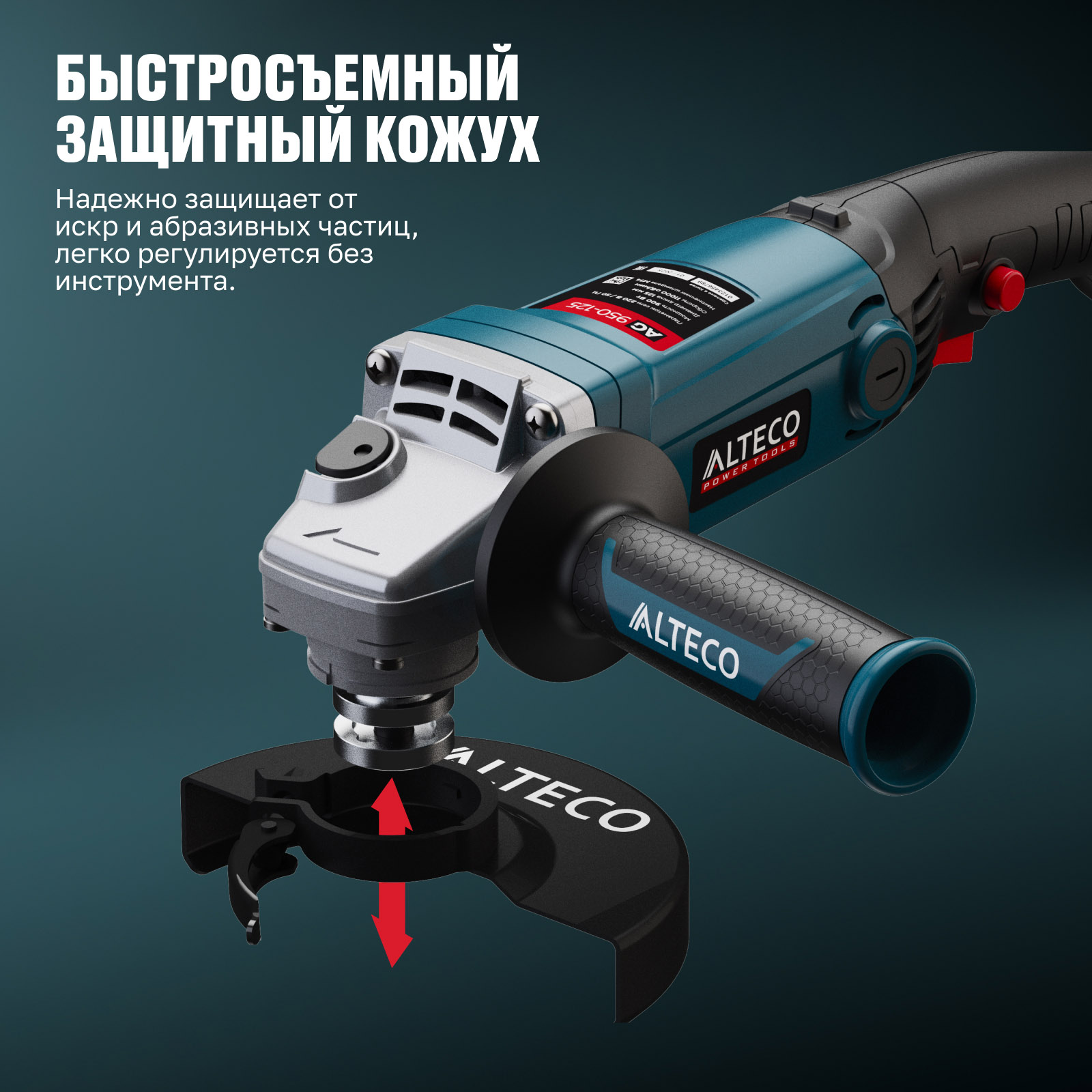 - Быстросъемный защитный кожух — надёжно защищает от искр и абразивных частиц, легко регулируется без инструмента.