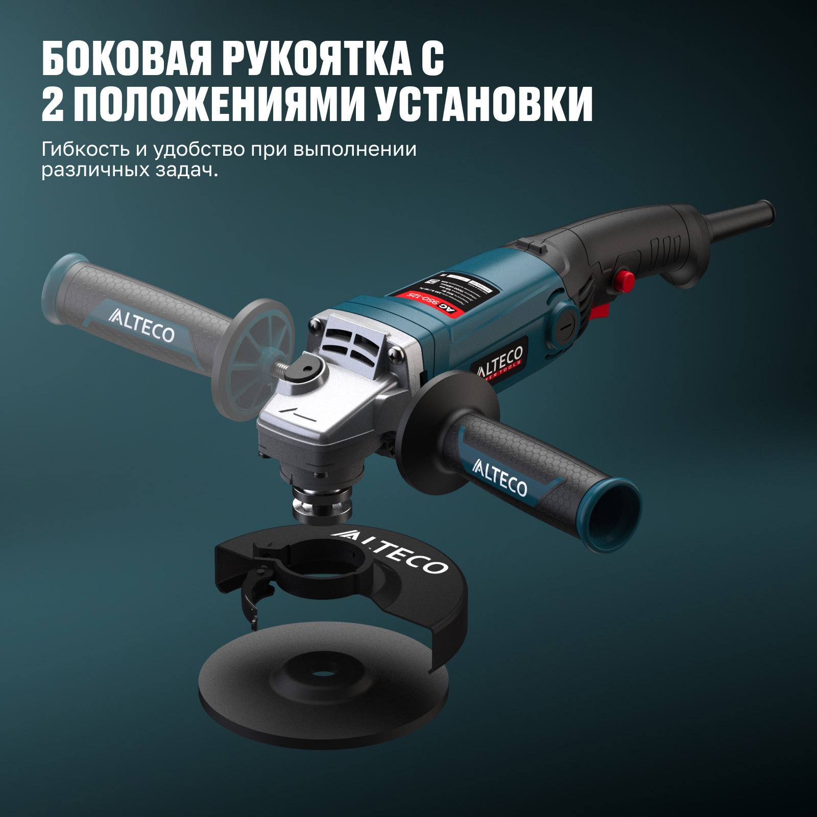 - Боковая рукоятка с 2 положениями установки — гибкость и удобство при выполнении различных задач.