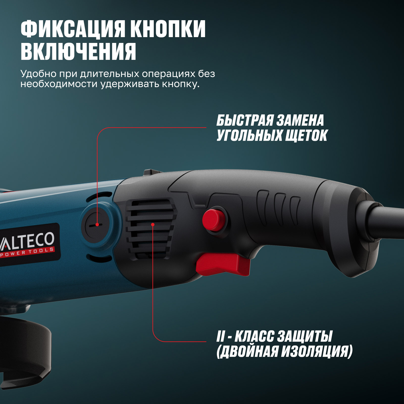 - Фиксация кнопки включения — удобно при длительных операциях без необходимости удерживать кнопку.