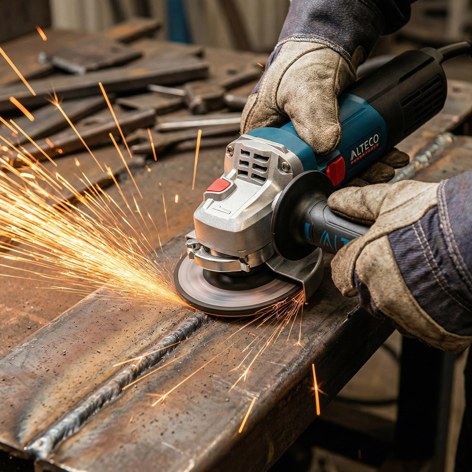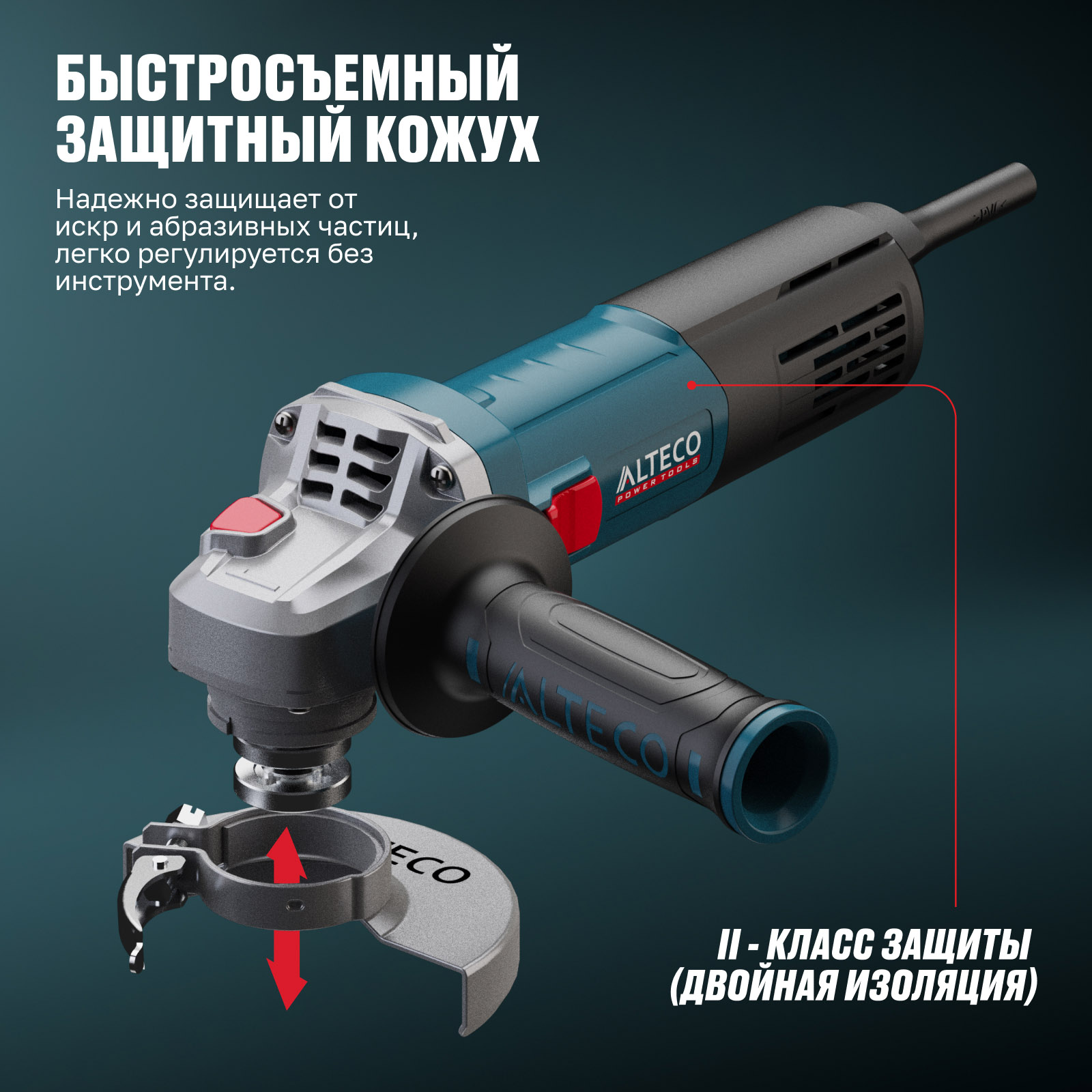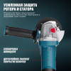 - Быстросъемный защитный кожух — надёжно защищает от искр и абразивных частиц, легко регулируется без инструмента.