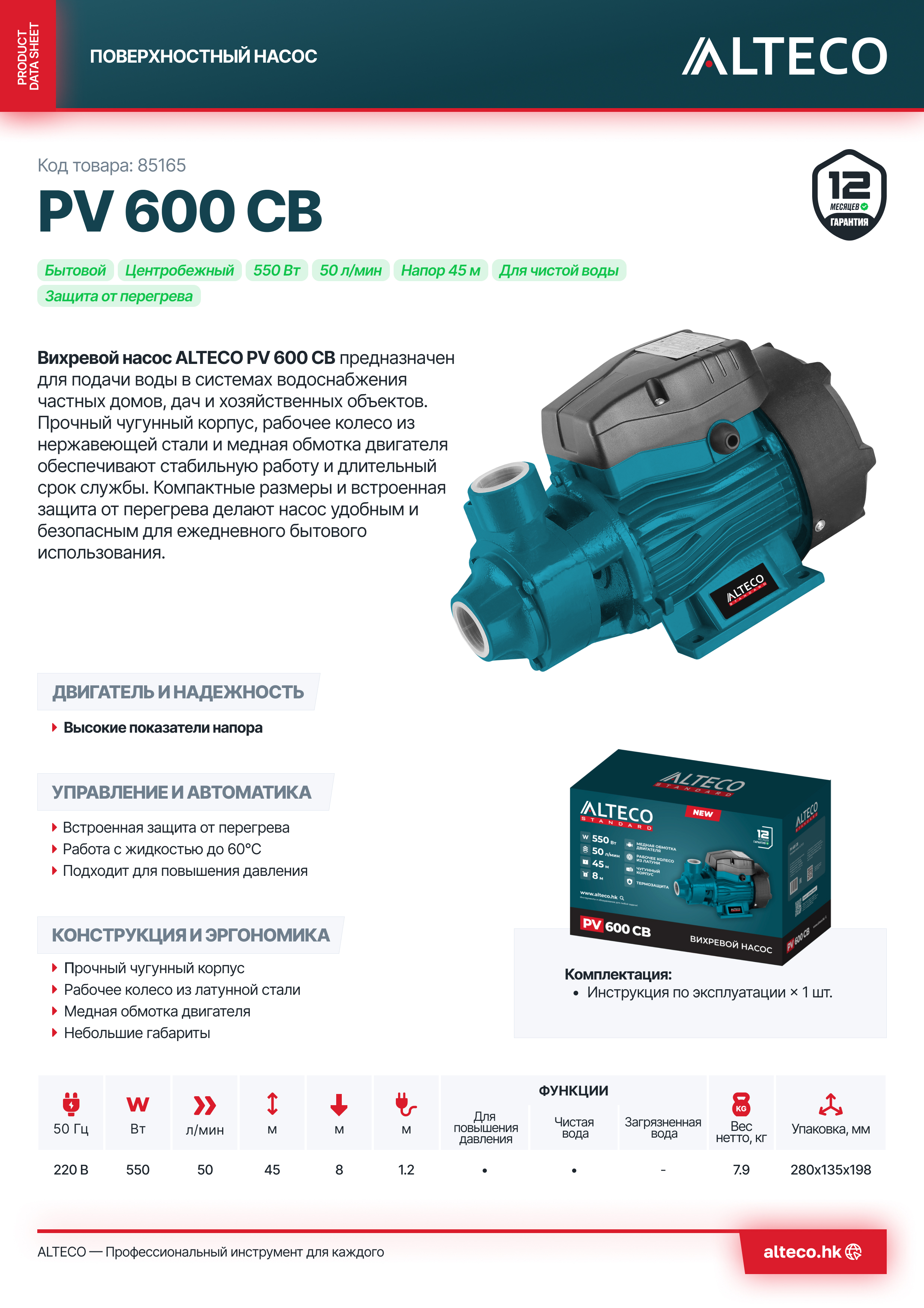 - Встроенная защита от перегрева — автоматически отключает насос при перегрузке или перегреве, предотвращая поломки. Повышает безопасность эксплуатации и снижает риск выхода оборудования из строя.